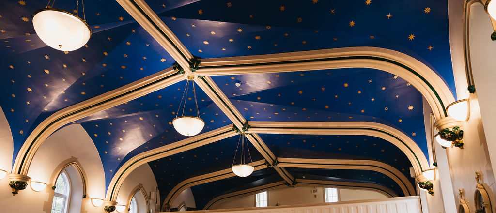 Reflection: When we look up to ceiling we see a multitude of stars, each hand painted (from stencils). The stars are in ordered lines suggesting that God’s creation follows a divinely ordained plan which is fixed or permanent. This plan we know to be our salvation in Christ.