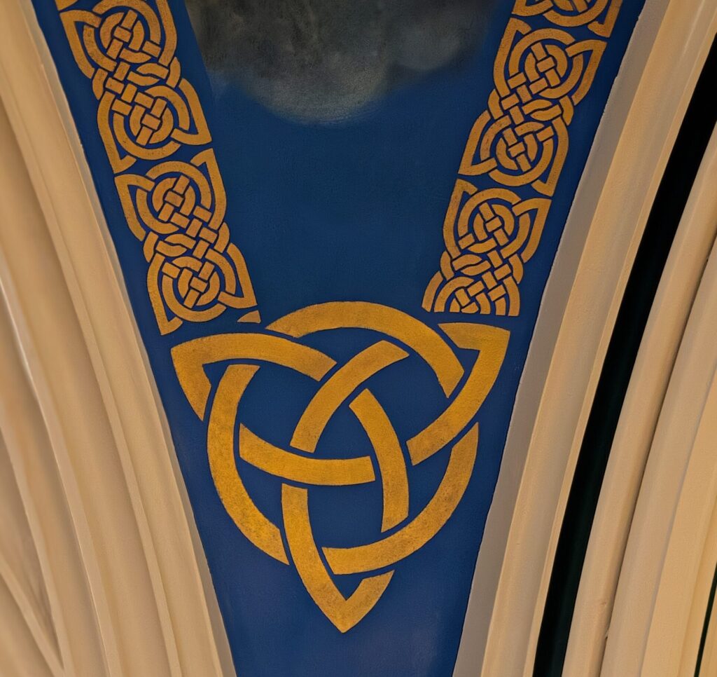 King David tells us in Psalm 19 that the heavens are telling the glory of God. We see images of that glory in the sacred art which adorns our ceiling. There is one other element that can speak to us and that is the Celtic know and overlapped circle found in the four corners of the crossing (the intersection of the nave transepts and sanctuary).