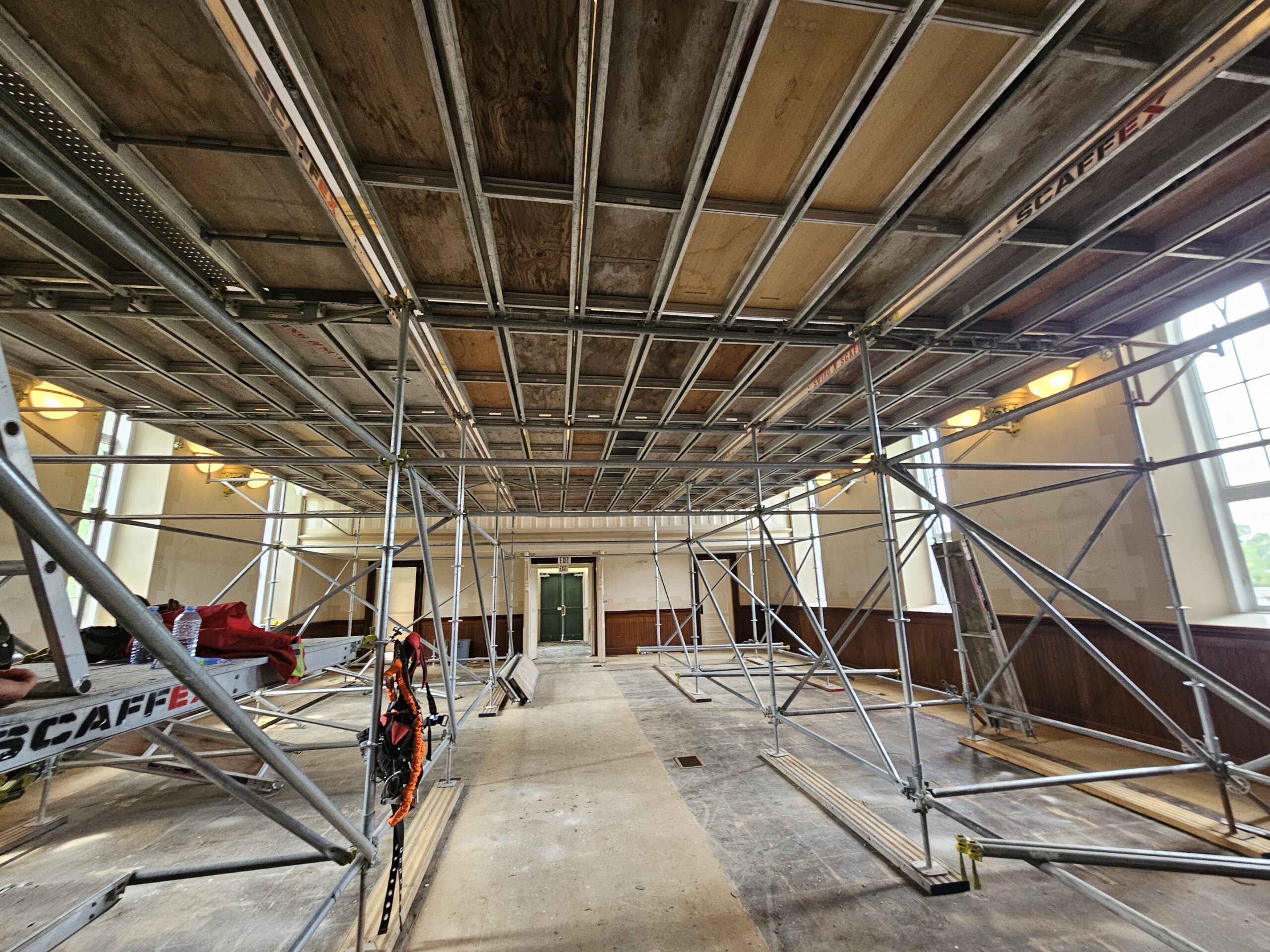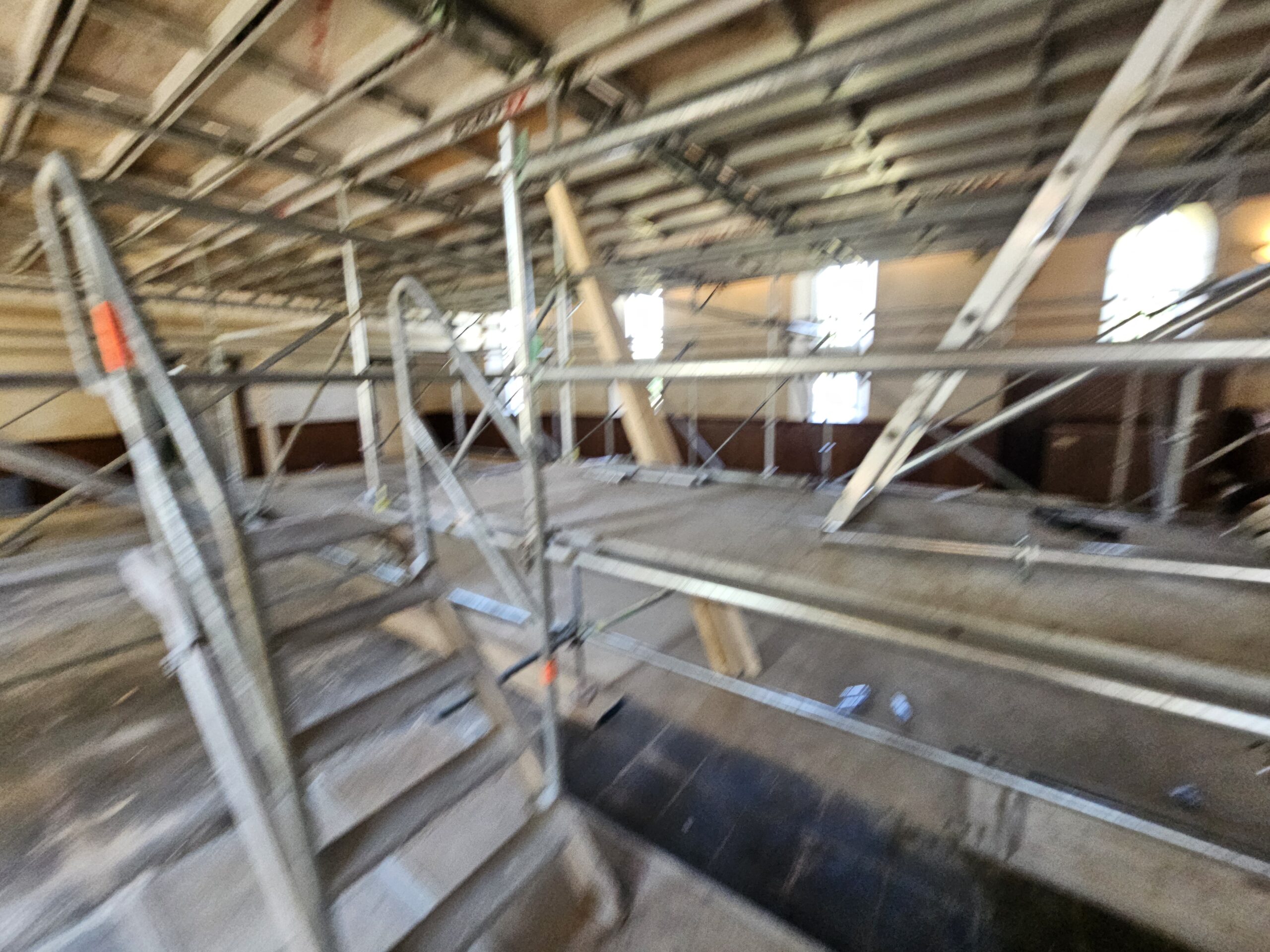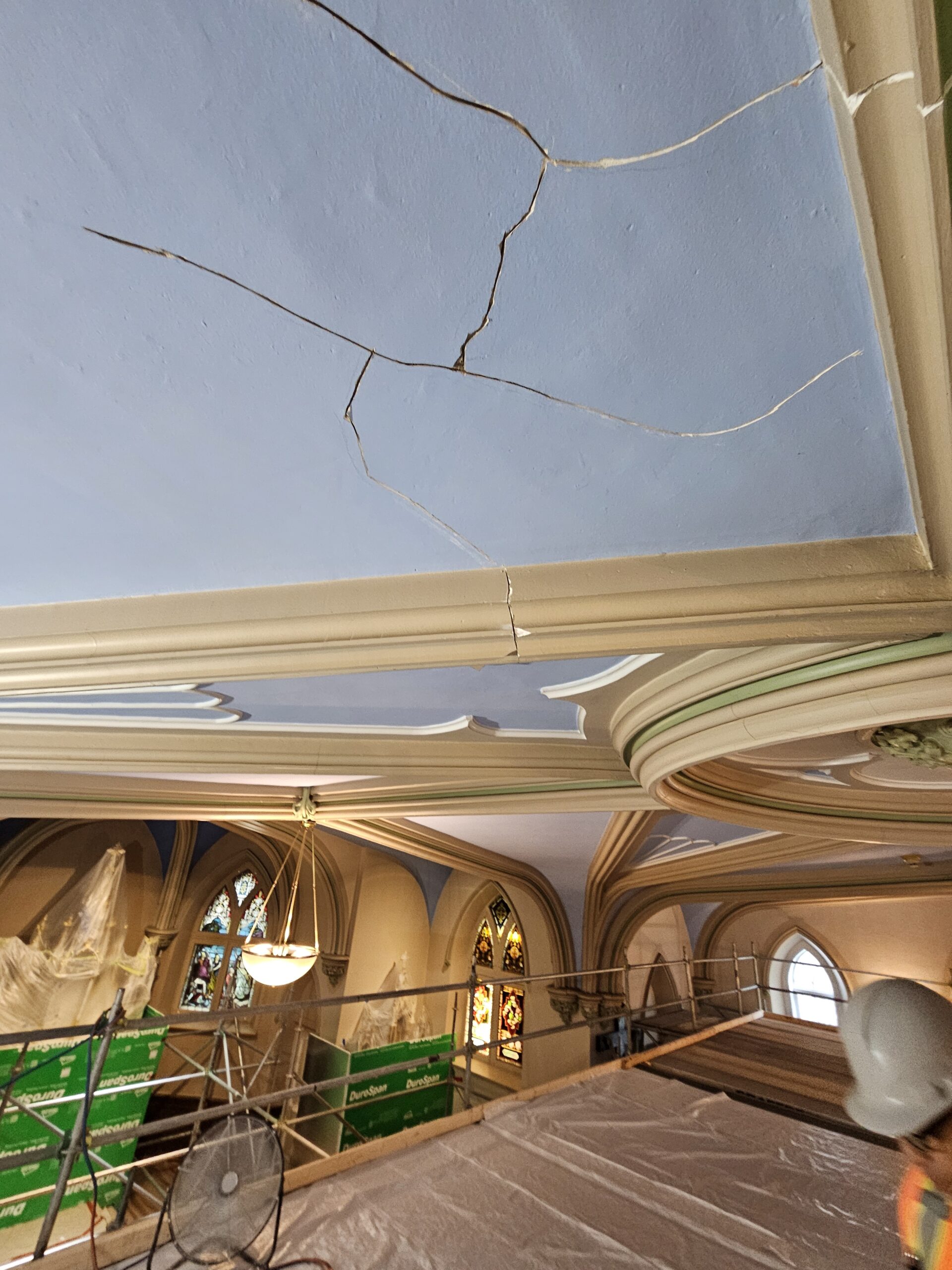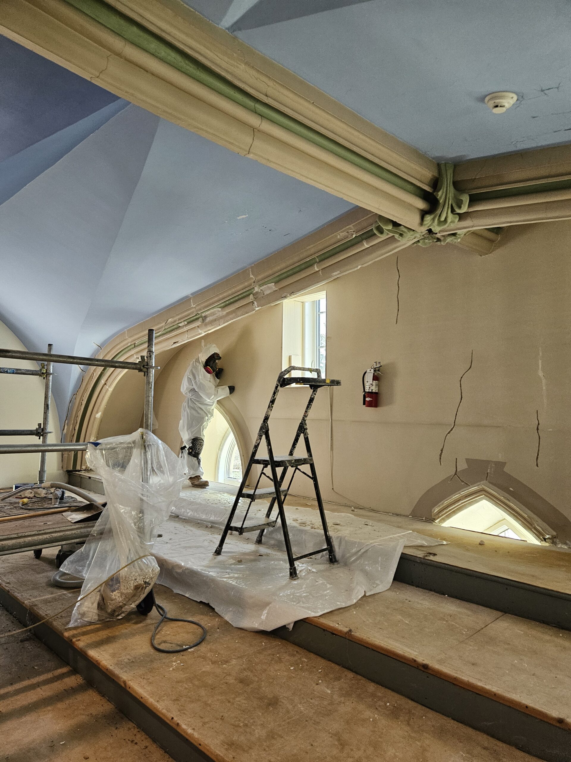Our church interior is in the midst of a full overhaul! While many hands made light work of moving out all materials from the church to the hall for use and/or temporary storage (Thanks again everyone who helped out!!) our contractors got to it. Every pew and kneeler went out the doors and was shipped off for repair/refinish. The flooring was ripped out and scraped off leaving a pleasant surprise of a solid base upon which we were able to build our current 16′ high scaffolding platform floor. Upon this, currently two teams of workers, the plaster team and the paint team, have been diligently working to move our project forward both individually and in unison.