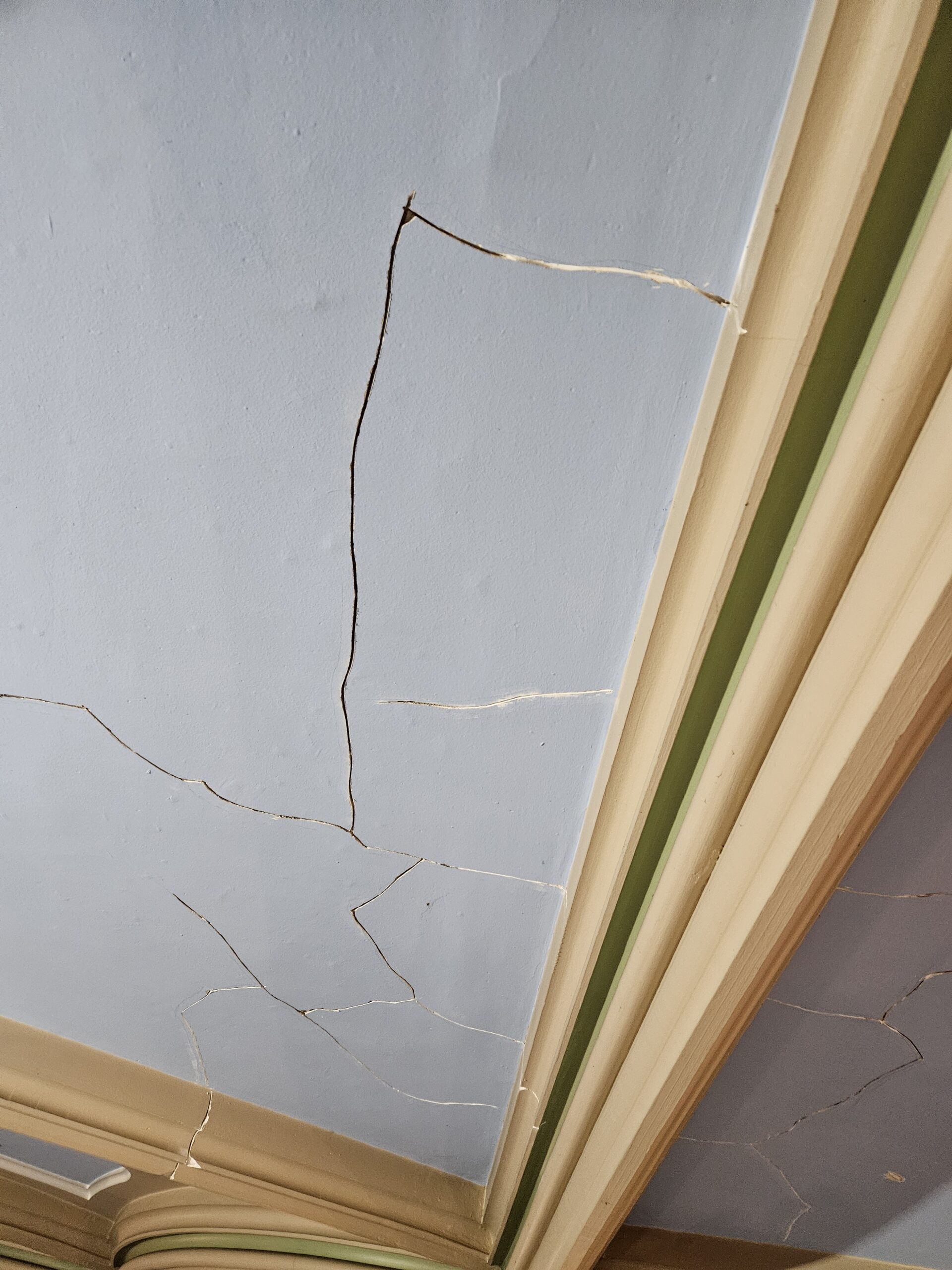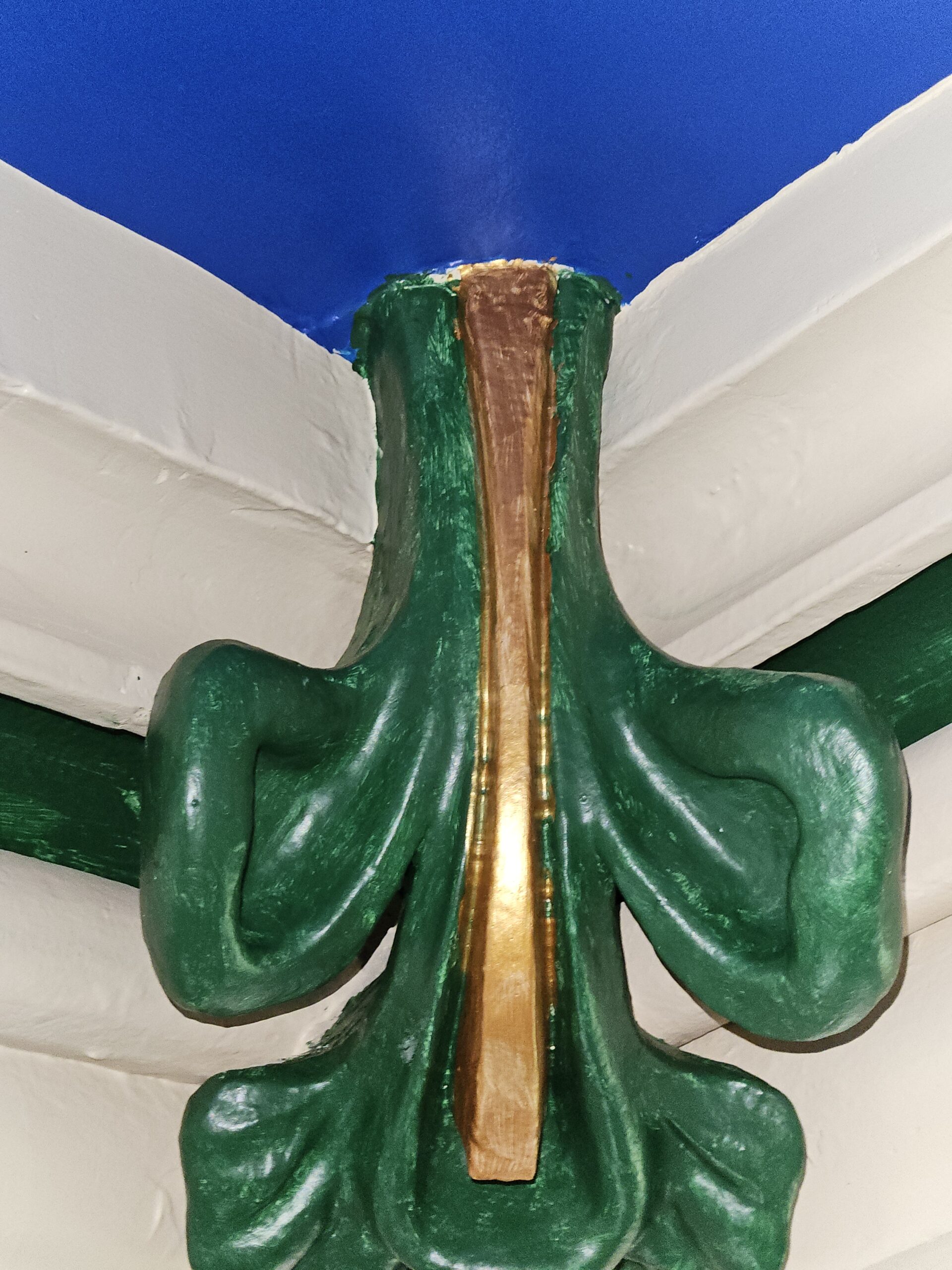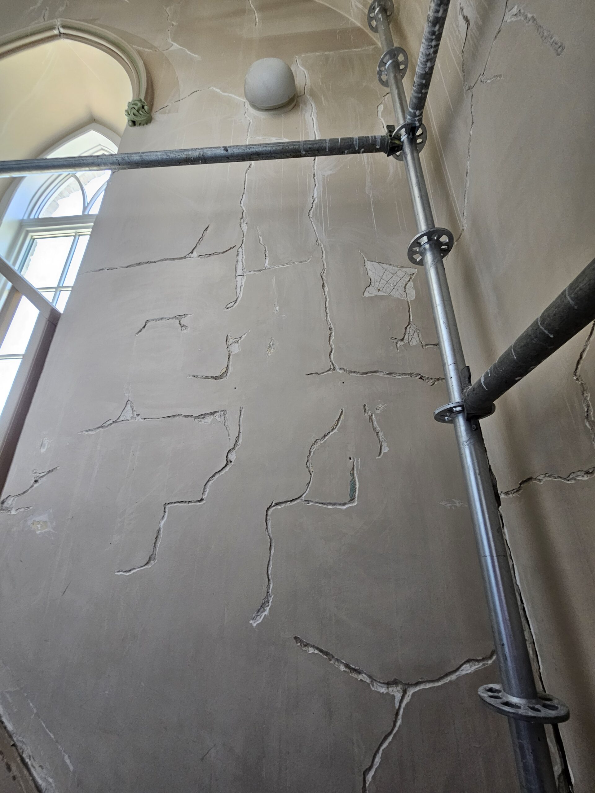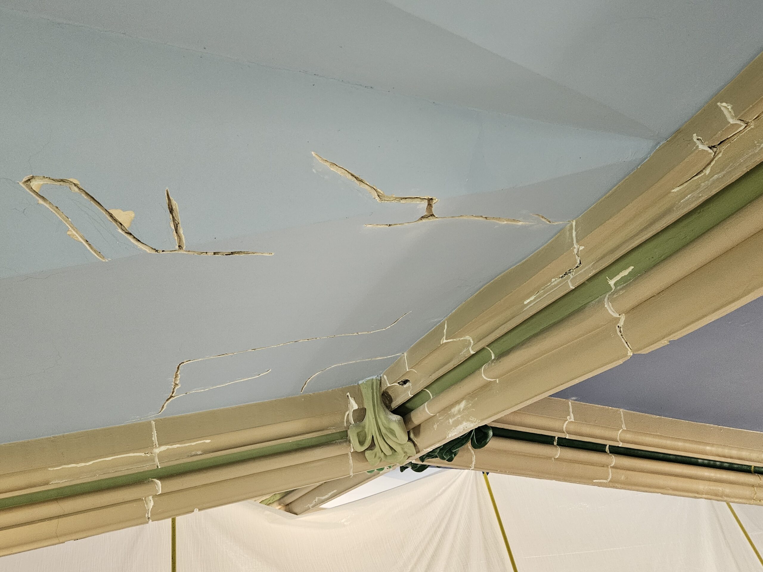 The plaster work has been extensive to say the least! Many many linear feet of cutouts into the walls and beams have been performed, followed by using a special consolidation liquid to solidify the material, which then is replastered and sanded all in preparation for the painting, As you may recall, some of the large ornamentals at the base of the ceiling beams were cracked apart. In our process of repair, we found as a surprise that they were filled with what we believe to be hessian plant and wood scrapings! This “old timey” use of these materials, as a stuffing, would have provided a lightweight and absorbent solution for the plaster constructors. Quite the find indeed! The plaster team’s wonderful efforts are making our structure solid and sound for future generations.