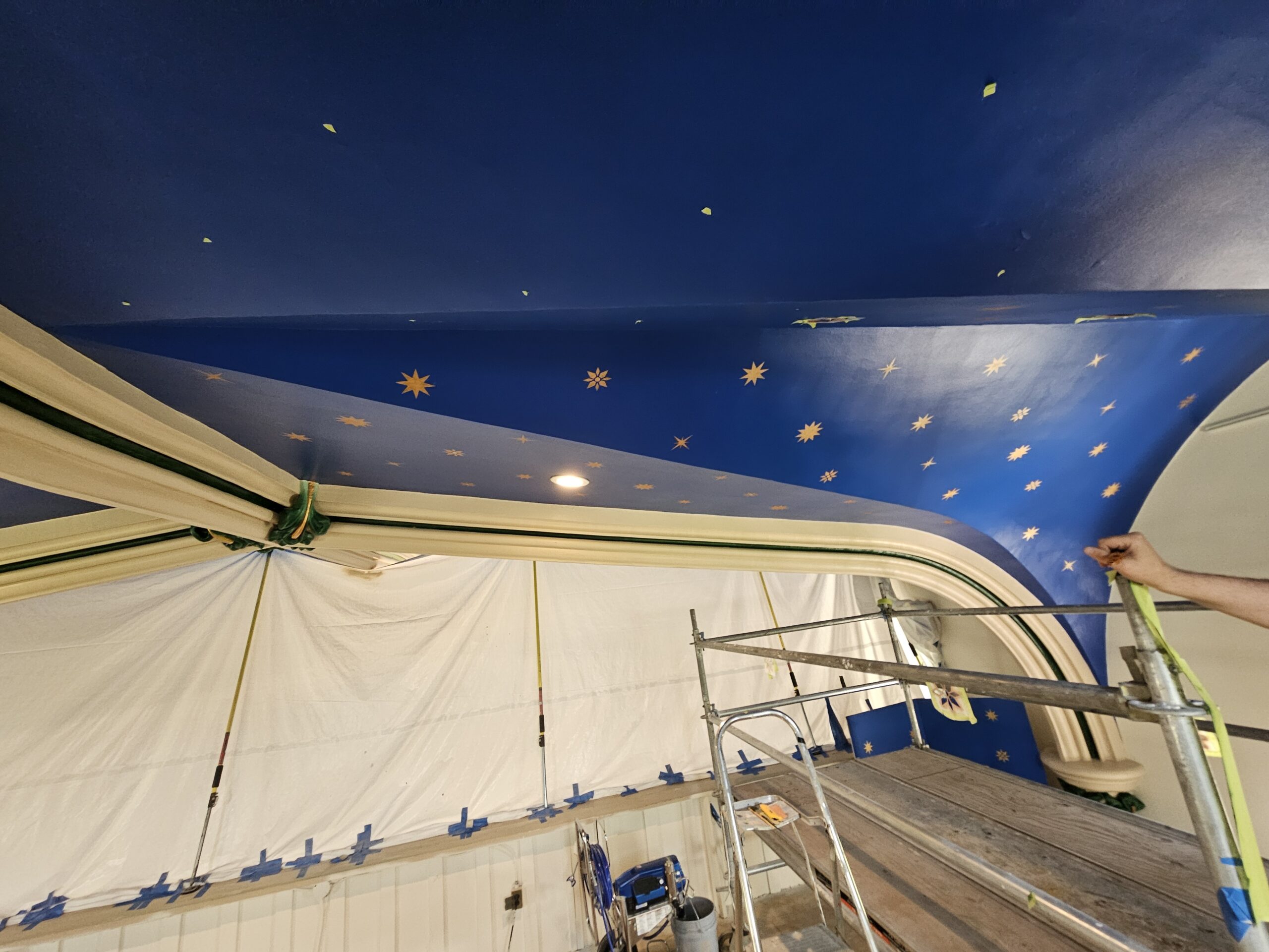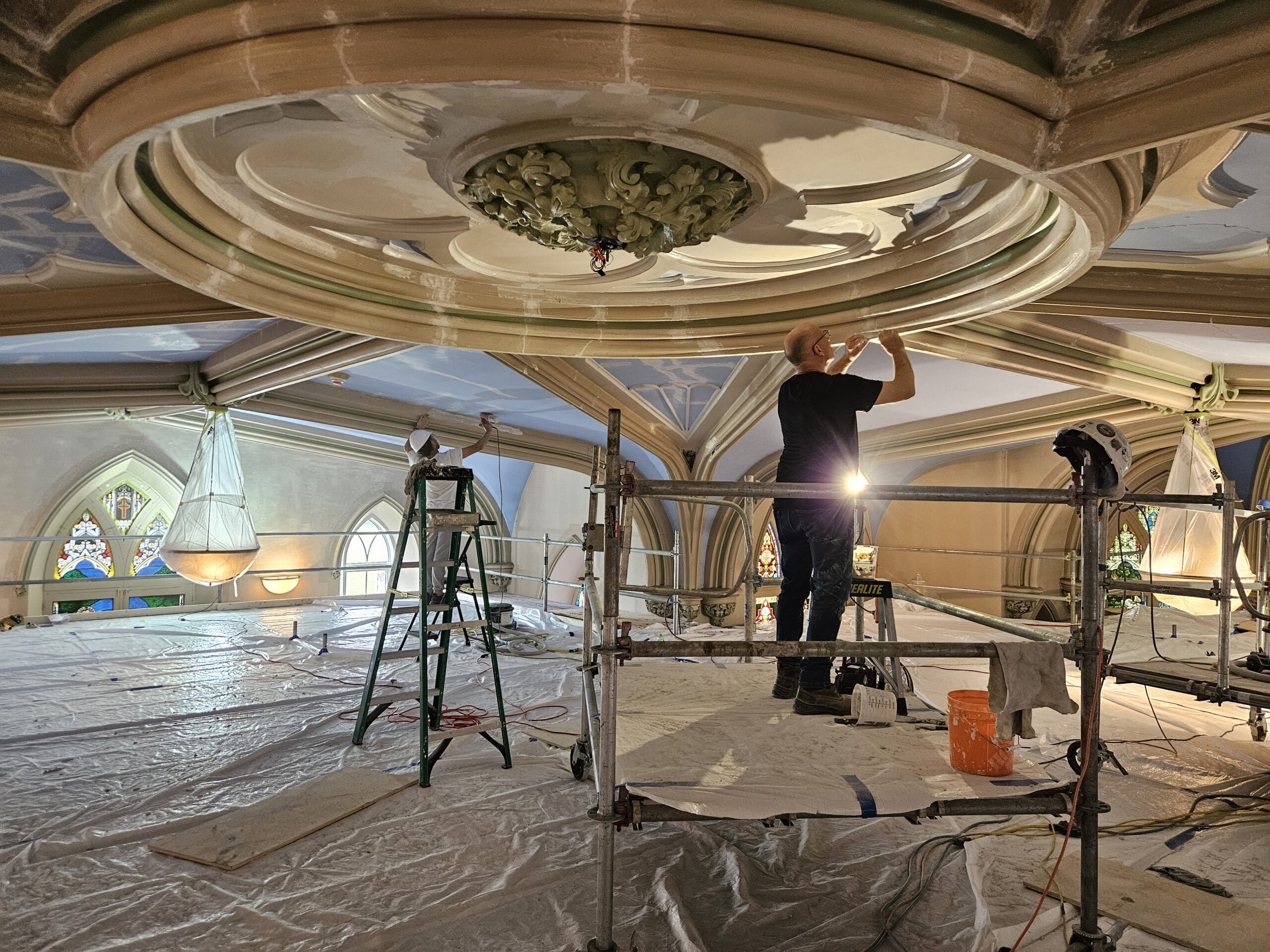 Our paint team (from BC) has been doing fantastic work as they have been supporting the plaster team as well as pushing forward with the incredible upgrade of our church! Priming, painting, sanding, and repeating the process all over again is making an excellent foundation for the final painting of the walls and ceiling. Our Restoration Committee approved colour selections are bringing new life to our church, and as the walls and ceiling get their new look, the church becomes more splendored than we could have hoped.